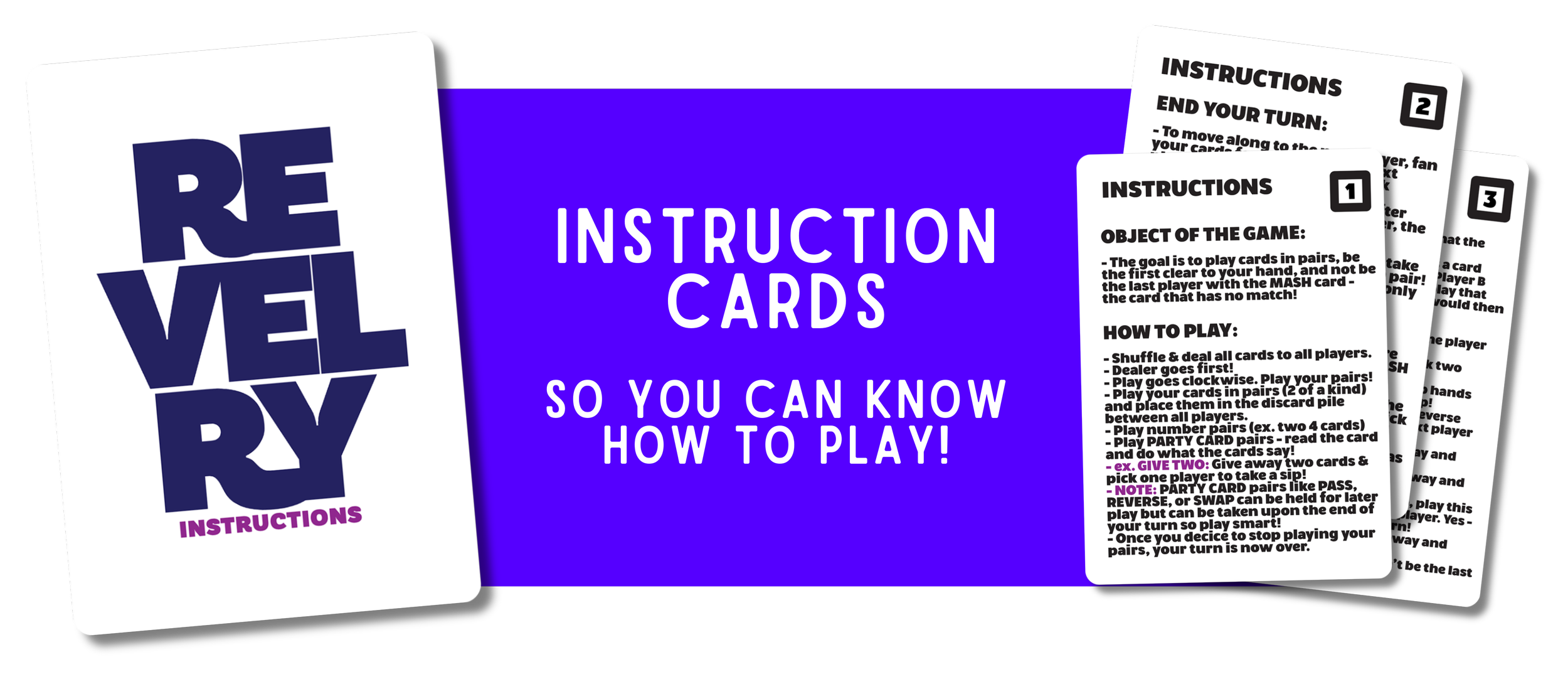 YOUR TURN: On your turn, play cards in pairs and place them in the discard pile - as many as you would like! Also on your turn, you can play PARTY CARD PAIRS (SUIT, SHAPE, FUN, PASS AND LUCKY 7 CARD) pairs as well. The only card that does NOT have a pair is the MASH Card. Get rid of it! If playing PARTY CARD pairs, play them as a pair and do what the cards tell you to do!